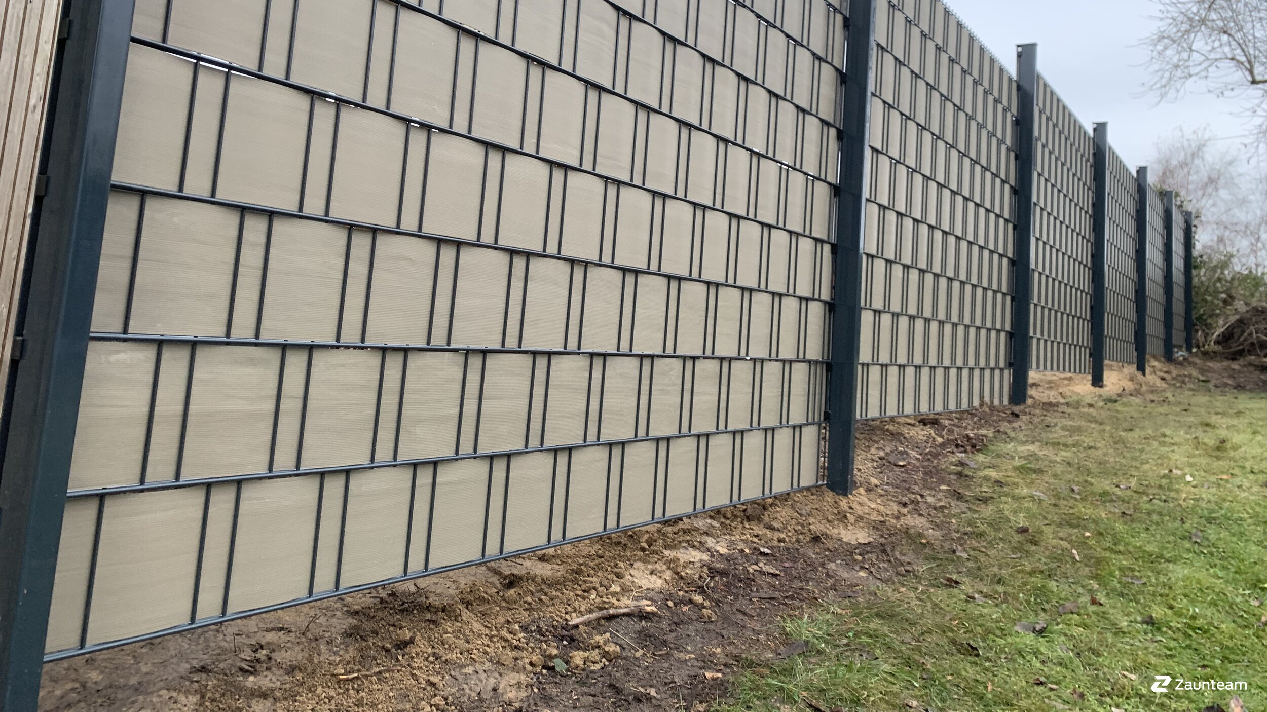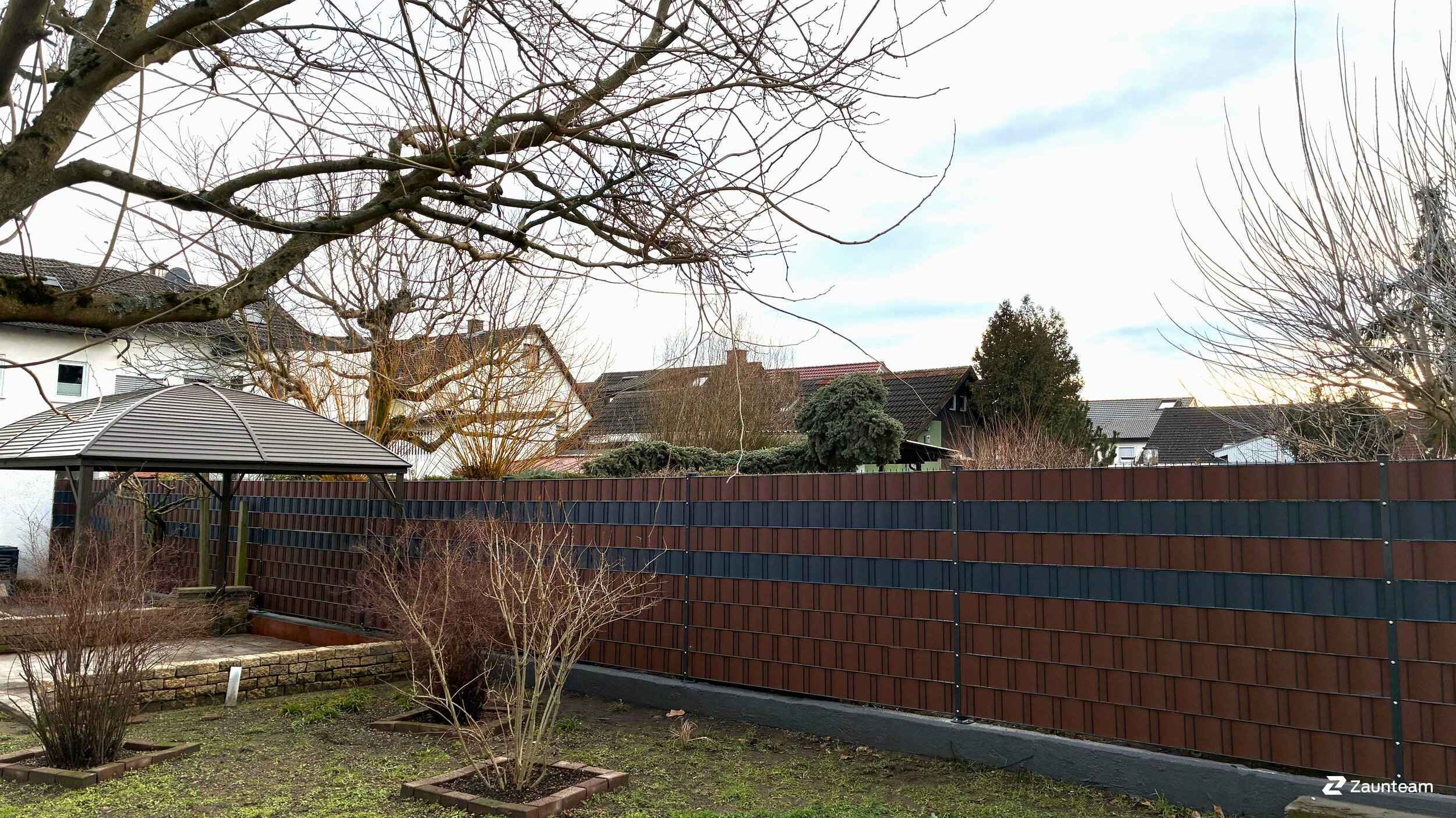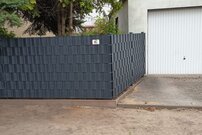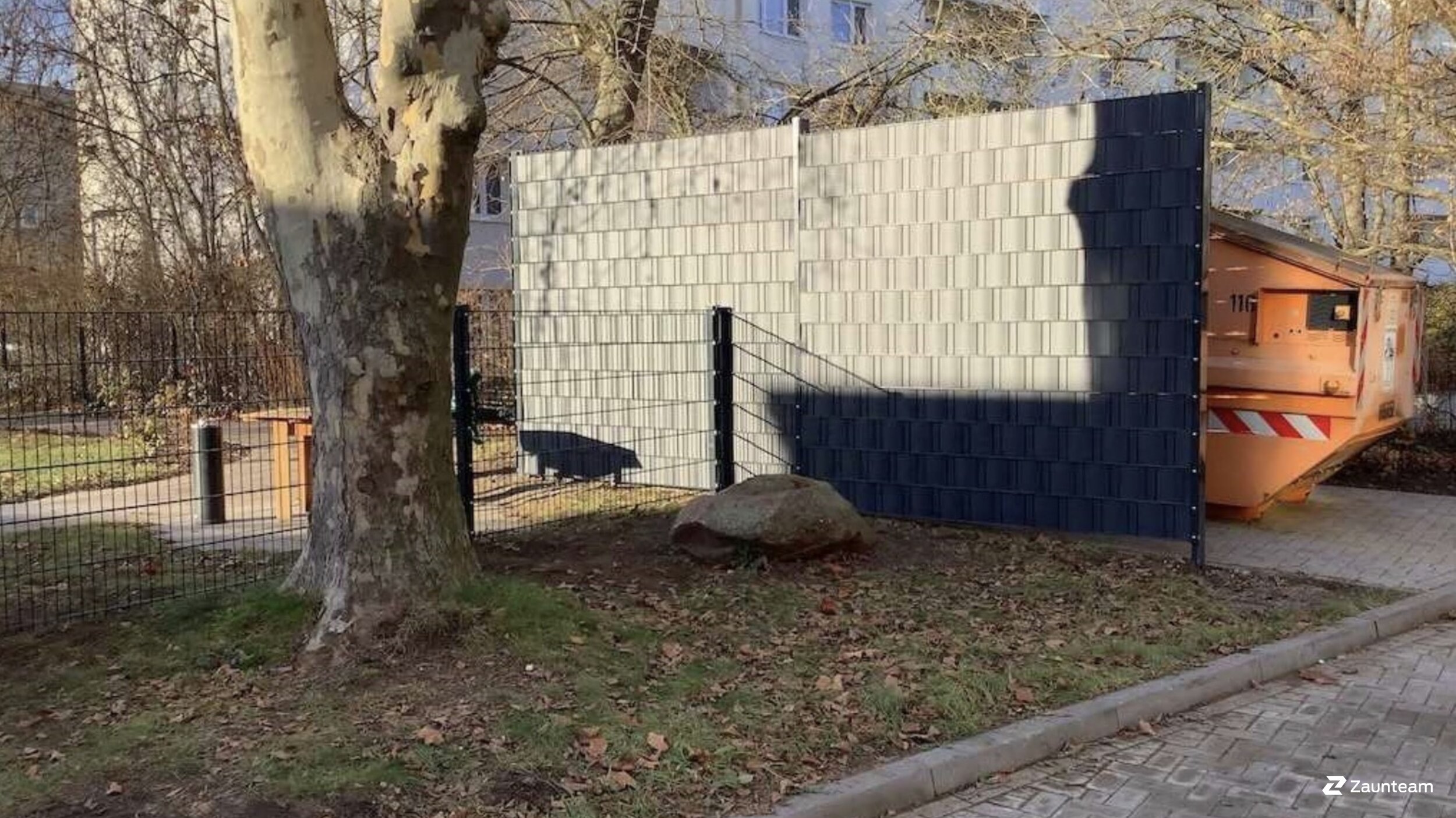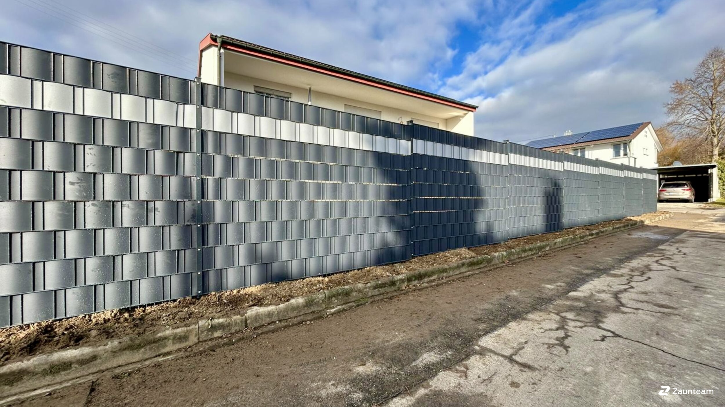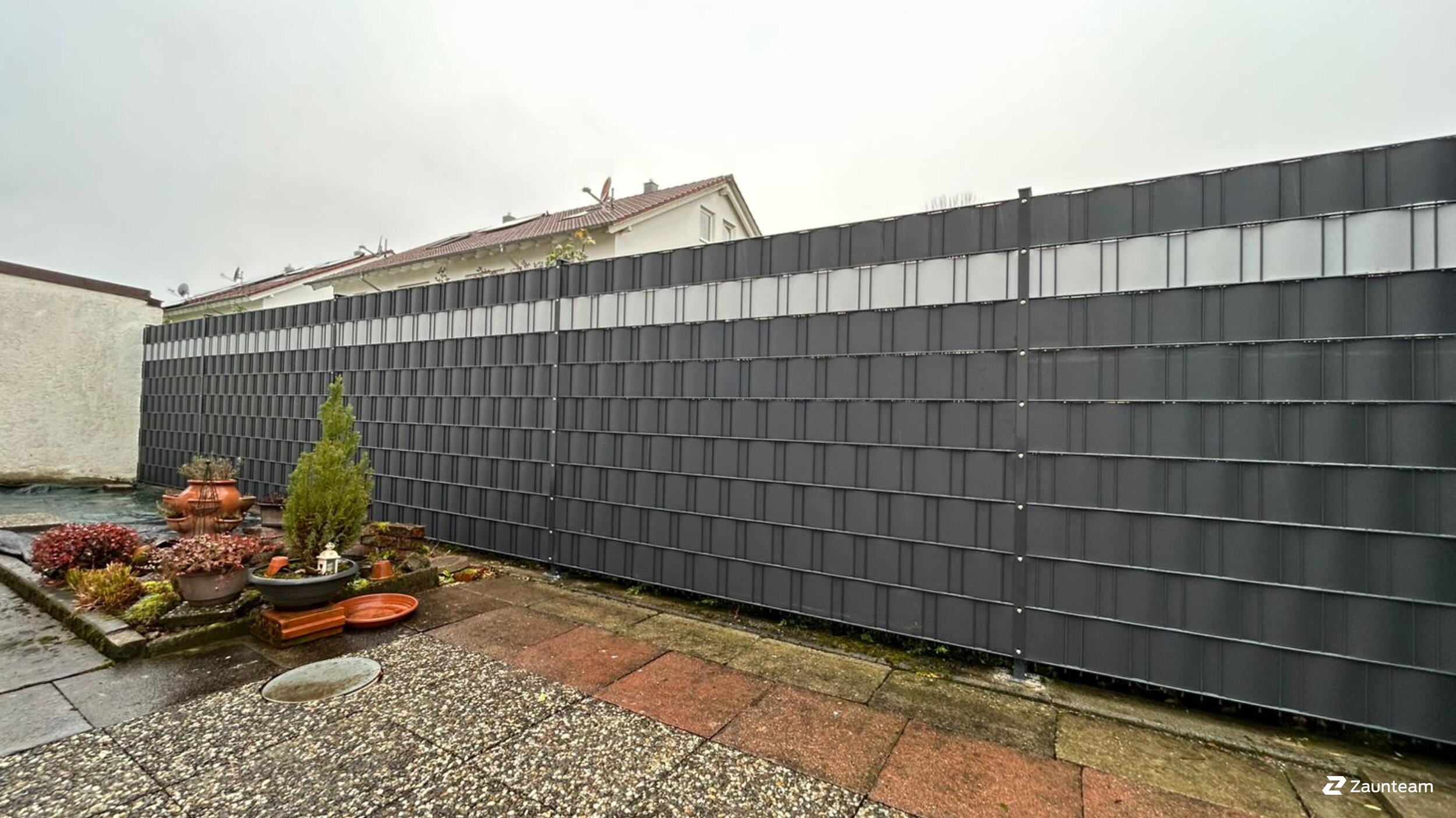 Dieser setzt auf die Vorteile von Metall und Kunststoff. Ebenso starke wie flexible Streifen aus Hart-PVC werden in genormte und voll verzinkte Stahlgitter-Elemente eingeflochten. Das ergibt einen Zaun ohne Verrottung, Rost und Moosbewuchs. Zeitaufwendige und kostspielige Pflegemassnahmen gehören der Vergangenheit an. Zahlreiche RAL-Farben sind lieferbar. Setzen Sie Akzente durch Dekorstreifen in einer Kontrastfarbe! Je nach Lage und Höhe des Zauns sind Verstärkungen der Pfosten notwendig, da ein Anbringen von Sichtschutzstreifen die Windlast am Zaun erhöht.